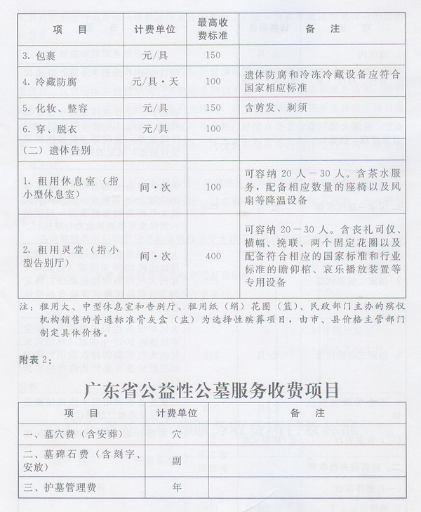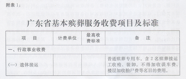 附表:1.广东省基本殡葬服务收费项目及标准